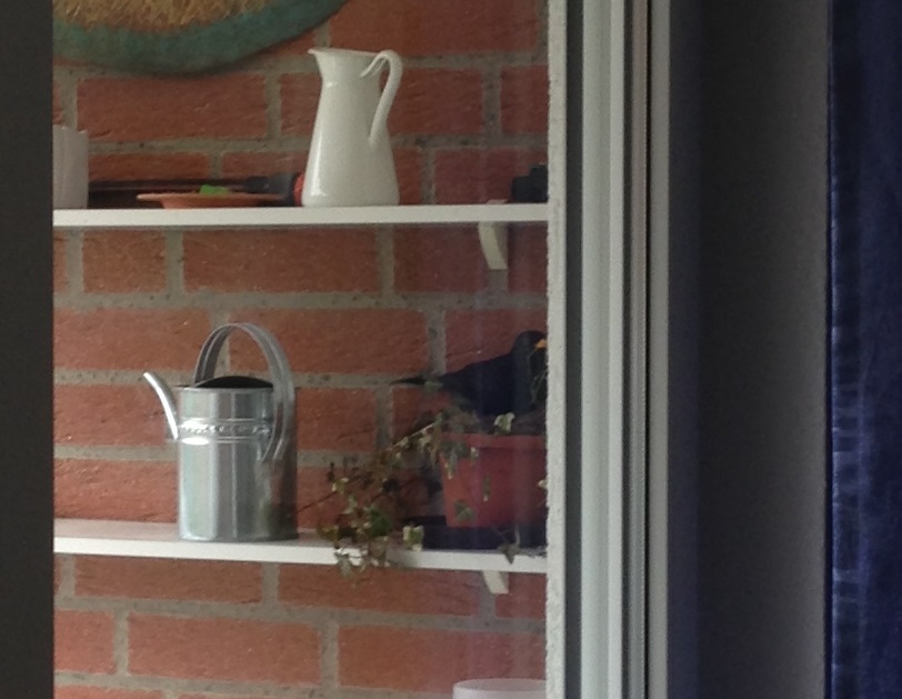 Heute Morgen habe ich ein Amselpaar dabei beobachtet, wie es auf einer kleinen Efeupflanze (Überbleibsel vom letzten Jahr) im Regal auf der überdachten Terrasse ein Nest bauen wollte. Habe schnell das Handy geholt und ein Bild gemacht. So durch die Scheibe ist es leider nicht so gut geworden, aber man kann die Amsel im Blumentopf erkennen.