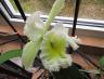 Die weiße Riesenorchideenblüte ist eine Cattleya.Sie hat sich 3 Jahre (seit dem Umtopfen und teilen) Zeit gelassen und blüht jetzt endlich wieder.